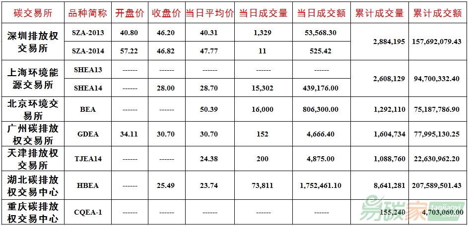 品種SZA-2013成交1,329噸,成交額53,568.30元,開盤價(jià)40.80元,最高價(jià)46.20元,最低價(jià)37.80元,收盤價(jià)46.20元,較前一交易日上漲10.00%。品種SZA-2014成交11噸,成交額525.42元,開盤價(jià)57.22元,最高價(jià)57.22元,最低價(jià)46.82元,收盤價(jià)46.82元,較前一交易日下跌10.00%。截止當(dāng)日,深圳碳