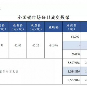 今日全國碳市場碳排放配額(CEA)掛牌協(xié)議交易成交量56,000噸,成交額2,364,470.00元,開盤價43.49元/噸,最高價43.50元/噸,最低價42.05元/噸,收盤價42.22元/噸,收盤價較前一日下跌3.14%。今日無大宗協(xié)議交易。今 ... ...