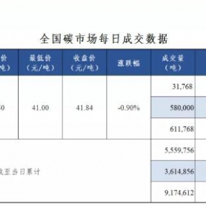 今日全國碳市場碳排放配額(CEA)掛牌協(xié)議交易成交量31,768噸,成交額1,329,268.00元,開盤價41.00元/噸,最高價43.50元/噸,最低價41.00元/噸,收盤價41.84元/噸,收盤價較前一日下跌0.90%。今日大宗協(xié)議交易成交量 ... ...